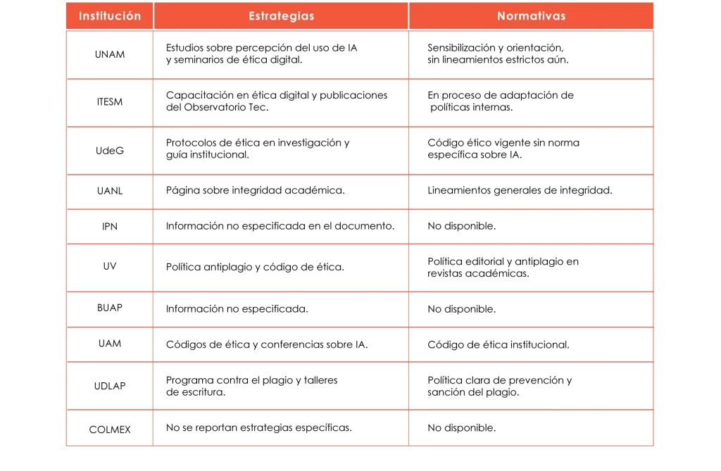 Pese a estos avances, se identificó que la mayoría de las universidades en México aún carecen de normativas específicas sobre el uso de la IAG en la producción académica, lo que genera incertidumbre en docentes y estudiantes sobre sus límites y alcances. Algunas instituciones han implementado programas de formación en ética digital y uso responsable de la IA, así como el desarrollo de cursos, seminarios y talleres dirigidos a docentes y estudiantes para concientizar sobre el impacto del uso indebido de la IAG en la integridad académica. Los resultados muestran que estas estrategias han sido efectivas para reducir el uso inapropiado de la IA, ya que los estudiantes muestran mayor disposición a emplear estas herramientas de manera ética cuando comprenden las consecuencias de su uso inadecuado.