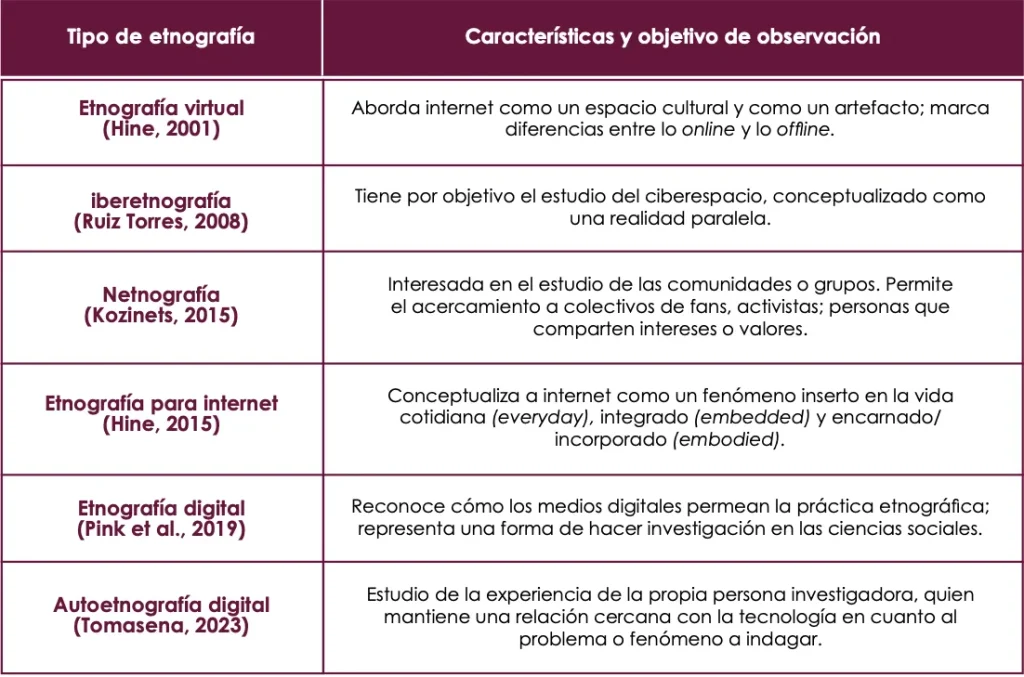 En la tabla siguiente, se enlistan las etnografías mencionadas, haciendo referencia a sus autoras o autores, a las características principales y distintivas en cuanto a la comprensión de la tecnología, las plataformas digitales o internet, así como a su definición y propósito de observación.
