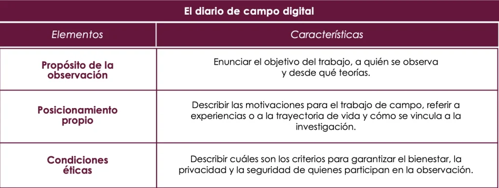 Como se ha mencionado anteriormente, este trabajo es resultado del acompañamiento a estudiantes de posgrado, a quienes, en el aula, se les ha invitado a elaborar diarios de campo digitales que incluyan el propósito de la observación, el posicionamiento propio frente a la investigación y las condiciones éticas, tal y como se expone en la Tabla 2.