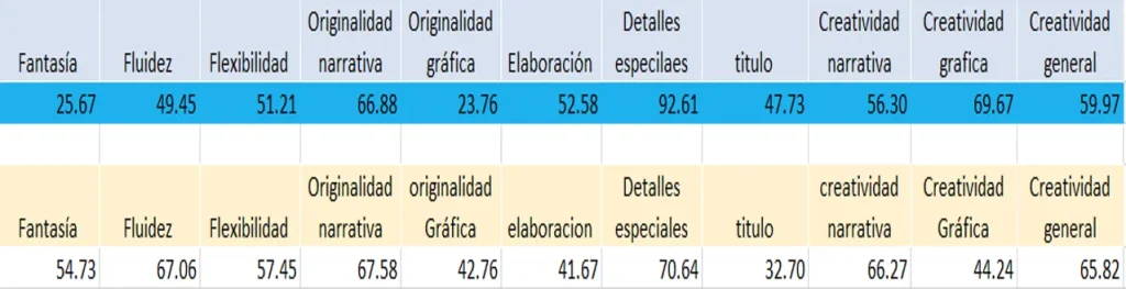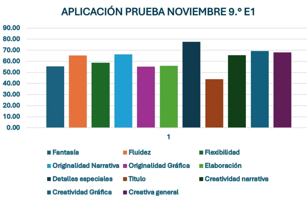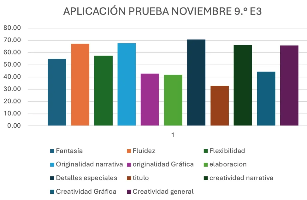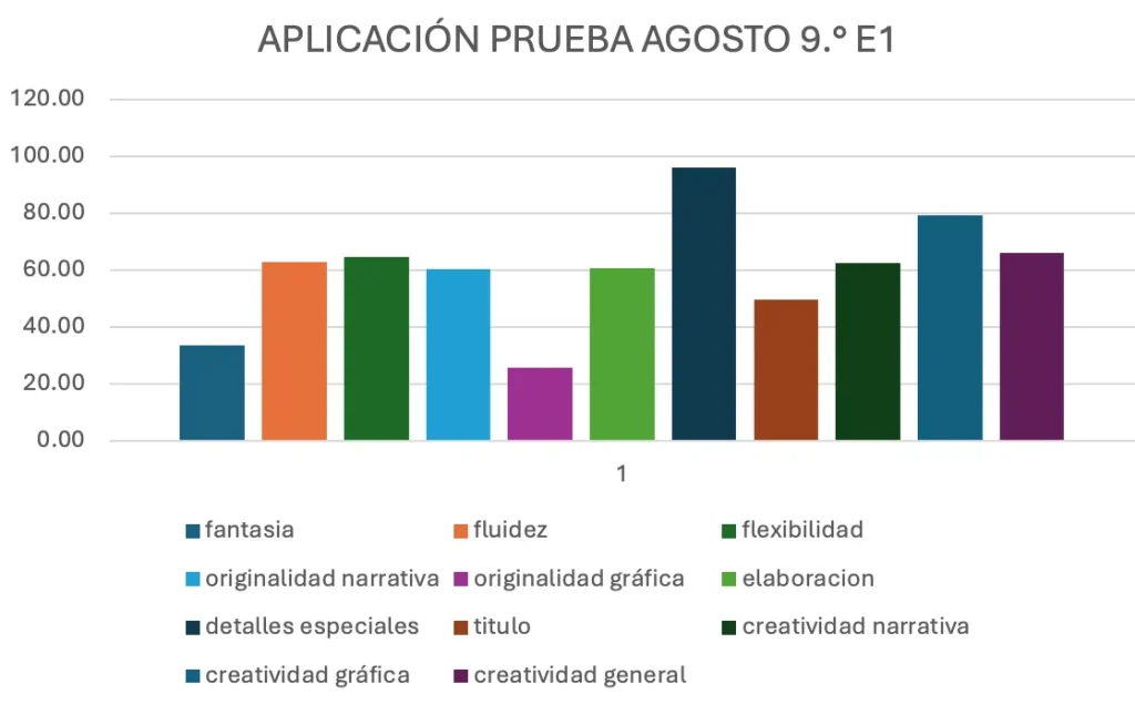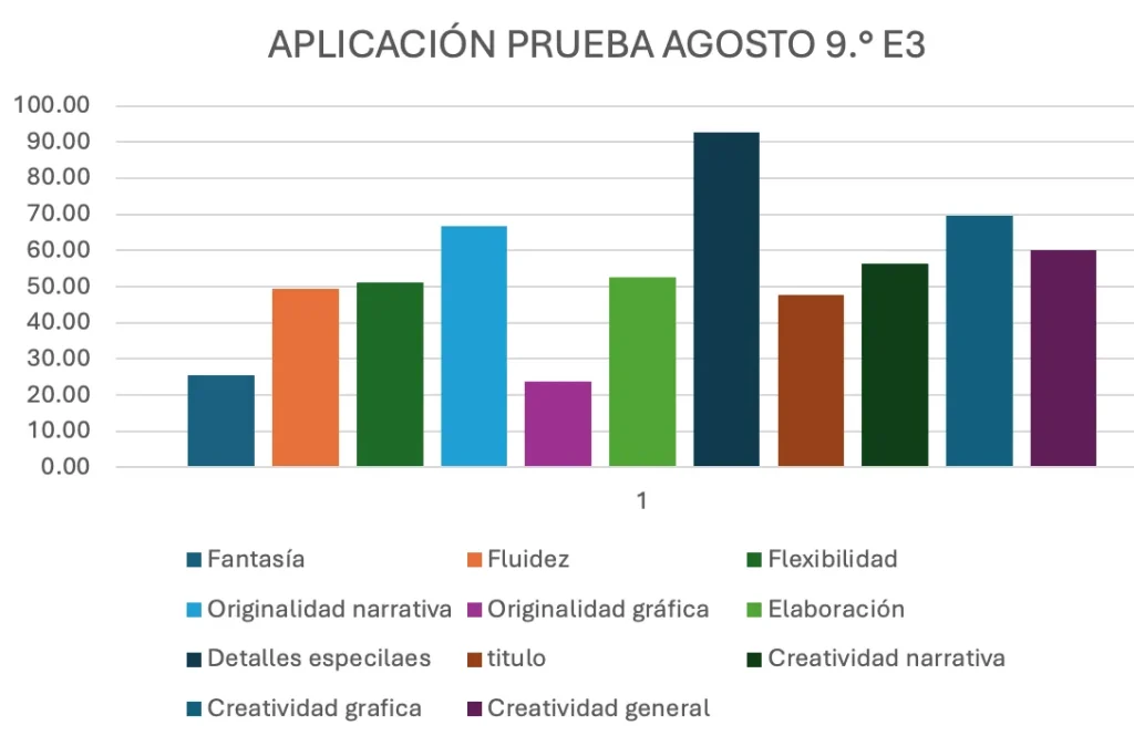 En el grupo 9.º E1, fue significativo que todos los indicadores, a excepción del de “título”, quedaron por encima del PC-50, de acuerdo con los baremos de la prueba. Hubo otros indicadores en donde hubo una disminución (flexibilidad, elaboración y creatividad gráfica), aun así, ninguno está por debajo del PC-50. En el caso del grupo 9.º E3, hubo disminución en cuatro indicadores (elaboración, detalles especiales, título, y creatividad gráfica), y aun cuando en algunos aumentó, son cuatro los que se encuentran por debajo del PC-50: originalidad gráfica, elaboración, título, creatividad gráfica.