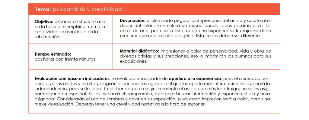 b) Determinar las actividades y técnicas a implementar en los planes de sesión durante el semestre agosto-diciembre 2023, que incluya la descripción, metodología, objetivos y formas de evaluación con los indicadores de la creatividad.