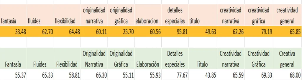 Los resultados que se han obtenido es que hubo aumento de la creatividad en ambos grupos, en algunos indicadores, pero hubo también otros indicadores en donde disminuyó, tanto de la creatividad narrativa, como de la creatividad gráfica. Se aplicaron las 20 sesiones con teoría y la práctica, con énfasis en la evaluación con indicadores de la creatividad. La Tabla 2 muestra los resultados del grupo 9.º E1; en color naranja es la aplicación en agosto, y en color verde es la aplicación en noviembre.