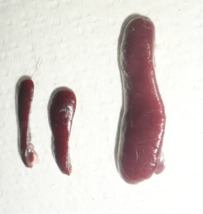 Figura 3. Esplenomegalia en ratones causada por Trichomonas vaginalis. Izquierda, bazos de tamaño normal; derecha, bazo aumentado de tamaño después del proceso infeccioso. Esto nos permite apreciar que los daños causados por este parásito van más allá de lo local.